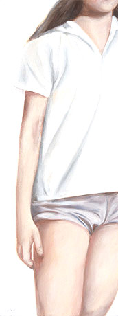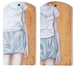 As part of the preparation for this exhibition, Haya Graetz-Ran published an ad in the town of Tivon, where she lives, asking people who were born during the 40s and 50b to show her photos from their childhood photo albums. Only women answered the ad. The artist looked through the albums and selected typical and innocent photos, immortalizing the women in that same short white dress, high shoes with folded white stocking, or in short trousers with an elastic band on the legs, and leather sandals. The position of the arm is similar in all of them. Of alt the dozens of photos she collected, Gnietz-Ran selected to focus on just a few. The positioning of the girls in the photos must be attributed to the photographers: a girl lifting the edge of her dress as if she were a dancer curtsying, or a shy, bewildered girl hiding the palms of her hands behind her body, or a girl on the verge of puberty wearing a decorated shirt which fails to hide the budding breasts, and in short rubber trousers, holding limply one arm at the side oMlie body. Over and over the viewer realizes that he cannot ignore the hints placed us the supposedly innocent painting. The girls are innocent. The painting is not: panties are showing under the skirt at one place (as in the “Good Girl” series and the “Breadboards 2″ series”), at another, the dramatic folds cutting through the girls groin multiply and focus the eyes on “that spot”, the spot of trauma and shame, as if they were an array of arrows pointing at the triangle (as in the “Short Trousers” series). Generally, the posture, the bare legs , are all so sensitive and soft. The painter’s touch in the “living flesh” regions, that is on the bare legs (as in the triptych “Ora”) of the girl wearing short trousers and suspenders, reveals a different treatment, in terms of painting, than the treatment of the fabric of the white dress, for example, which softly fades into the white canvas. As I mentioned previously, the bare skin gets many layers of color: a primary layer of red covered by layers of off-white, ochre, pinks, blues, greens. The clues join together to create a disturbing experience. Is it possible that all of those girls, who had grown up since and became women, mothers, wives, even grandmothers, is it possible that they were all subjected to sexual harassment? Yes, it is. All of them. All of them, since I have yet to meet a woman who does not, at the right confessional moment, invoke a memory, either a vivid or a vague one, of some disturbing experience of this nature.