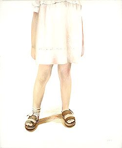 Every new painting with the bandaged, cutoff girl is part of the obsessive process of dealing with trauma. Six large, clean painting, all showing almost the same girl, no background she is alone and abandoned in empty space, and she has no head, only the edges of a dress and feet. This reminds me of one of the early works, also one of my favorite works, by Michal Ne’eman “Vania (Vaizata)”, 1975 (Tel-Aviv Museum). A photo-image of a girl, cut off at the waist, appears several times in this conceptual work. The girl has a dress and legs. Her panties are pulled down to her knees. She is headless. Across from the row of headless girl images there is a row with another recurring photo-image: a ceiling fan. The fan is offered as a head substitute, as something that is located way up, and puts on airs. The fan and its blades also look like a weapon, dangerous. Something that can cut a head off is one is not careful. Michal Ne’eman offers us a critical discourse in the form of a woman as a victim of a male chauvinistic stereotype which reduces her to a provocative sex object, a headless, mindless body, but with pulled down panties, exposing the Freudian observation that anatomy is destiny. Haya Graetz-Ran also “cuts off’ the head of the girl from “Pure & Simple Penmanship” and forces the observer to focus on the “disaster area”. The chilling act of cutting literally represents an abuse against something whole and innocent: a castration, rift, break, trauma. But it also focuses our eyes on the girl’s lower half. As far as the painting itself is concerned, the girl’s legs are painted using at least ten plies of oil paint. The dress, however, is hardly touched. A couple of plies, no more, the flesh, the skin, the exposed, vulnerable spot, are the focus of attention. Our eyes are pulled immediately to the girl’s crossed legs. The bandage is there as a diversion, as another attempt to silence something that one learns to keep even from a mother’s eyes. More so from the eyes of a demanding, manipulative mother, so deeply immersed in self-pity, that she is oblivious to the suffering of her daughter.